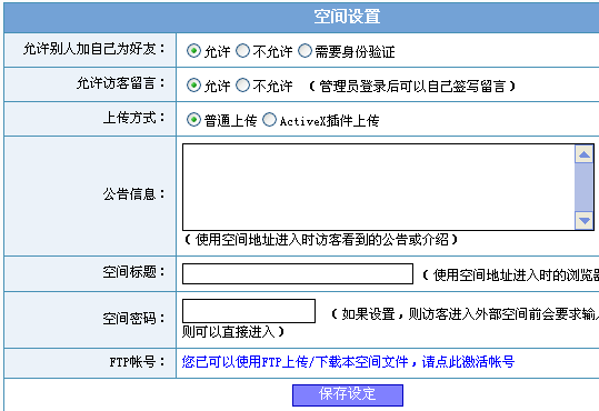 十二、空间设置 点击左侧的“空间设置”链接即会显示以下页面: |