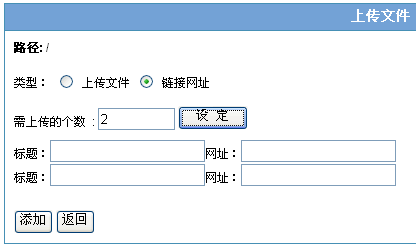 上传完毕会自动返回原目录并刷新页面,可以看到刚刚上传的文件。 类型:链接网址: 如果选择添加链接网址一项,您可以添加互联网上的任意链接在空间里面,添加完点击这个链接名称,会自动弹出链接所在的网页,相应于一个网络书签的功能。 可以任意设定要添加的网址个数,标题为网盘空间中显示的文件名称,网址则是要跳转到的目标地址,输入完后点击添加,会自动在您的空间处出现以此标题为名称的文件,点击后即可打开对应网址的页面。 |